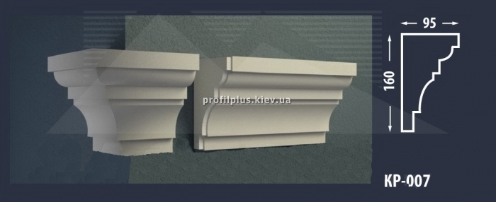 Технические характеристики карниза КН-007. Габариты карниза: глубина - 160 милиметров; высота - 95 милиметров; длинна - 2 метра. Материал основы карниза: пенополистирол. Армирующее покрытие.Торцовые поверхности карниза имеют пазы для правильного и надежного соединения.