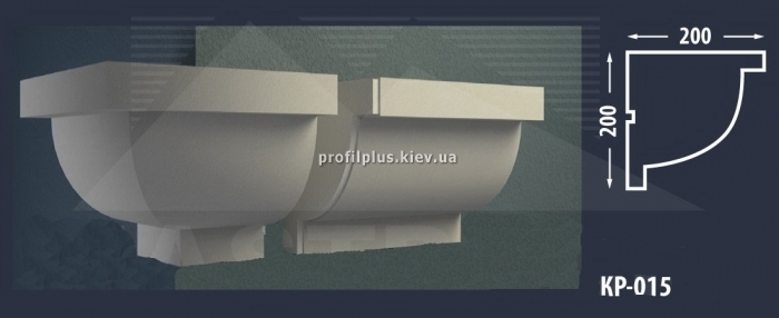 Технические характеристики карниза КН-015. Габариты карниза: глубина - 200 милиметров; высота - 200 милиметров; длинна - 2 метра. Материал основы карниза: пенополистирол. Армирующее покрытие.Торцовые поверхности карниза имеют пазы для правильного и надежного соединения.